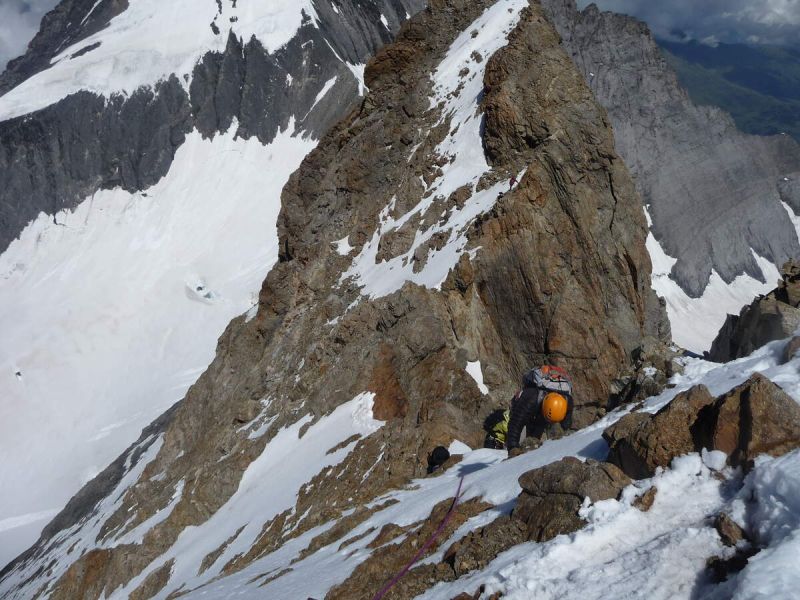 The Mittellegi Ridge is a serious alpine climb graded AD/IV–V with long sections of exposed scrambling and climbing. You must have prior experience with multi-pitch climbing, glacier travel, and mountaineering at high altitude.